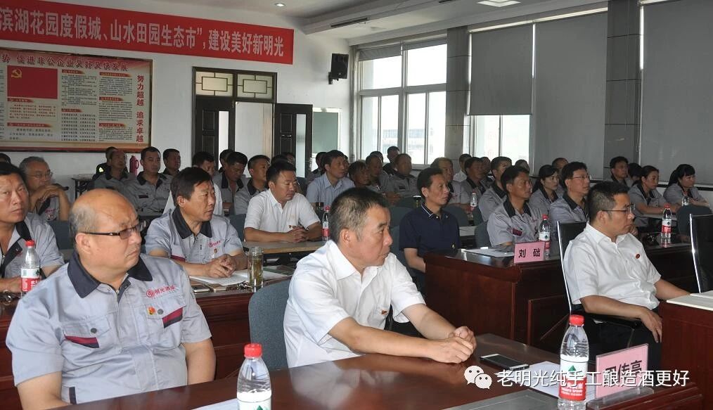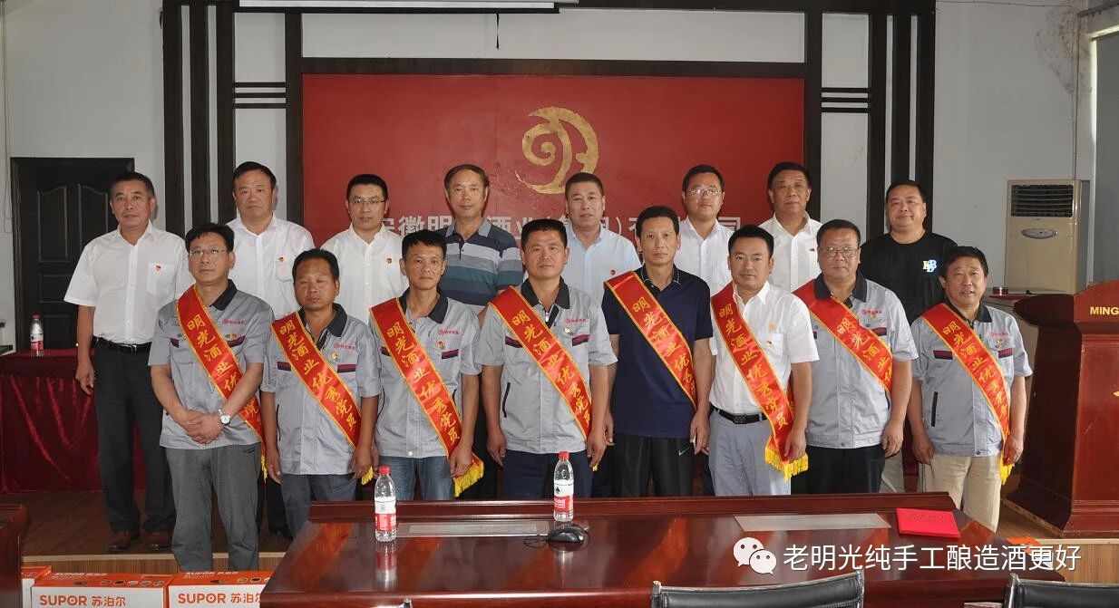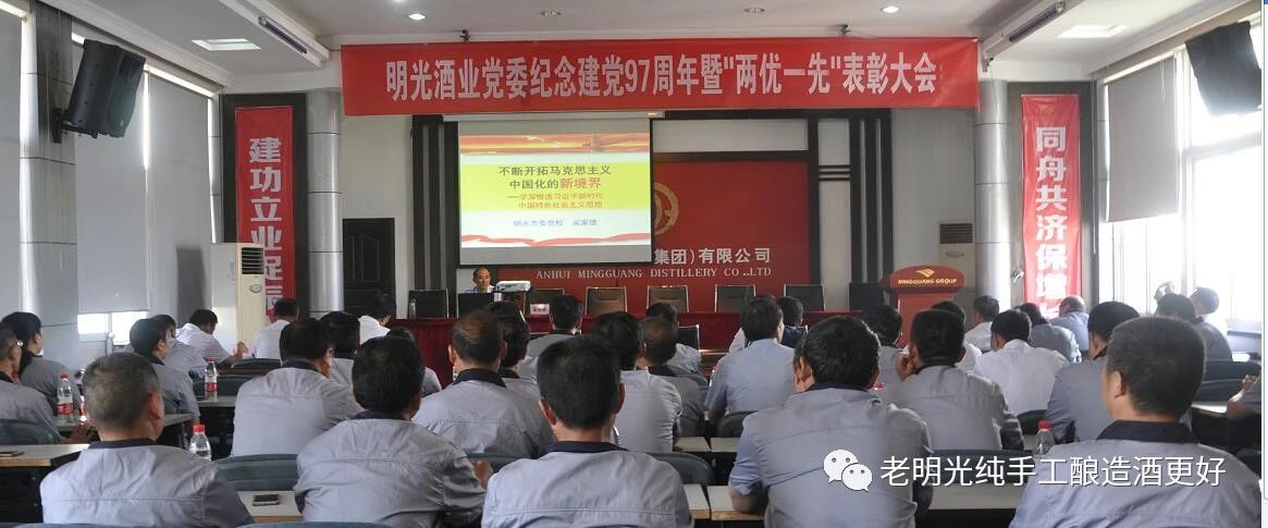 2018年6月29日,明光酒業黨委紀念建黨97周年“兩優一先”表彰大會,在明光酒業五樓會議室隆重召開。市委非公工委副書記 、選派辦主任吳峰、明光酒業董事長王振爽、明酒政治指導員董俊杰及明酒黨委班子成員在主席臺就座,全體黨員、入黨積極分子百余人參加會議。會議由公司黨委副書記龐宗生主持。