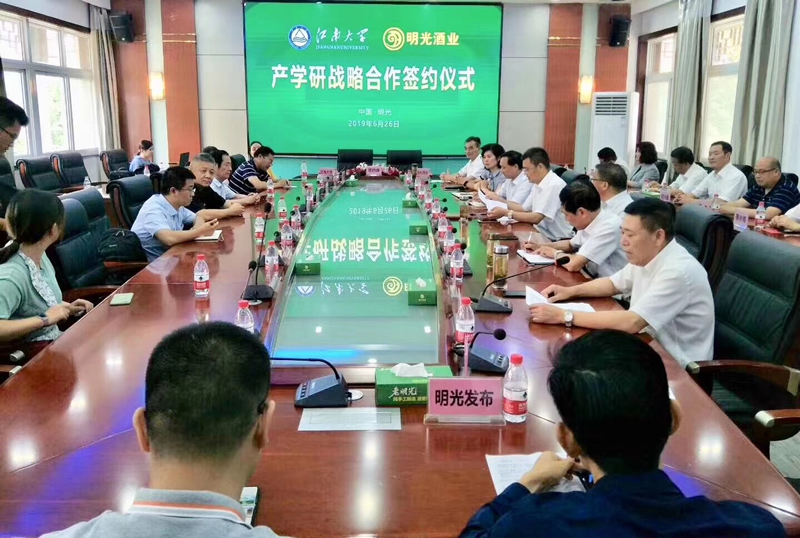 6月26日,明光酒業與江南大學產學研戰略合作簽約儀式在明光酒業舉行。江南大學副校長、博士生導師、教授徐巖,安徽省酒業協會秘書長李文漢,明光市政協主席張言平,江南大學生物工程學院博士、副教授陳雙,安徽大學健康研究所所長張部昌,安徽大學生命學院博士、副教授黃訓端,市財政局局長李仁標、經信局局長吳文良、科技局局長劉平、市場監督管理局局長許叢峰、城投公司總經理王超,明光酒業董事長王振爽,明光酒業總經理鞏建等領導出席。儀式由明光酒業董事長王振爽主持。
