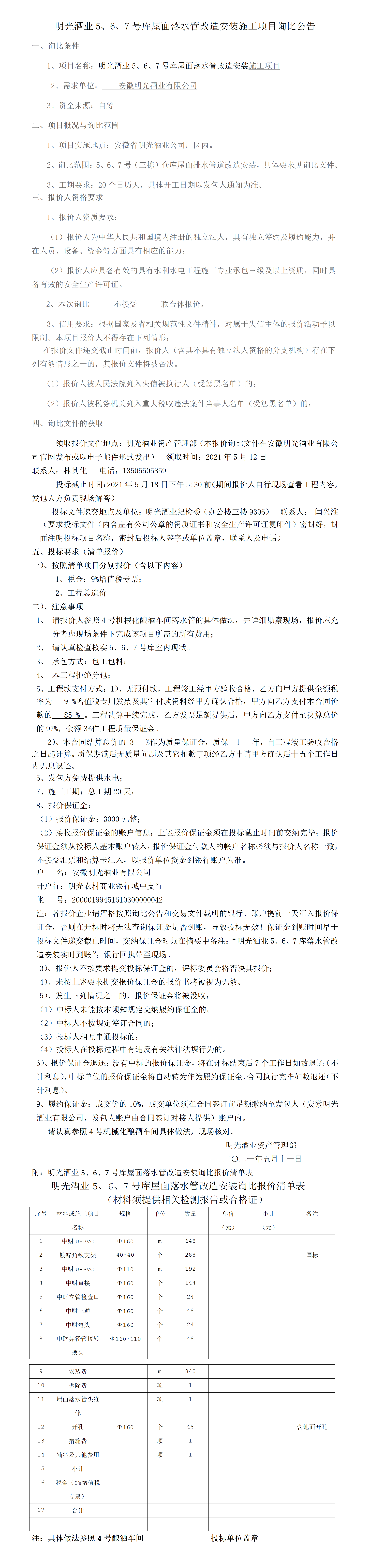 明光酒業(yè)5、6、7號庫屋面落水管改造安裝施工項目詢比公告