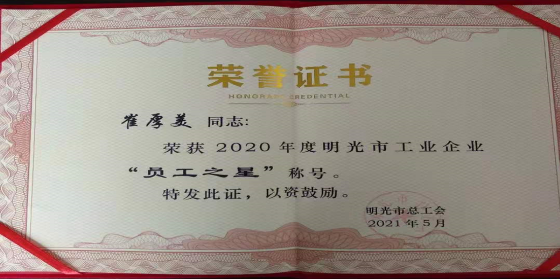 在這次表彰中,安徽明光酒業有限公司技術質量部榮獲2020年度滁州市“工人先鋒號”稱號,安徽明光酒業有限公司員工崔厚美以網上投票排名第一被授予明光市“員工之星”。