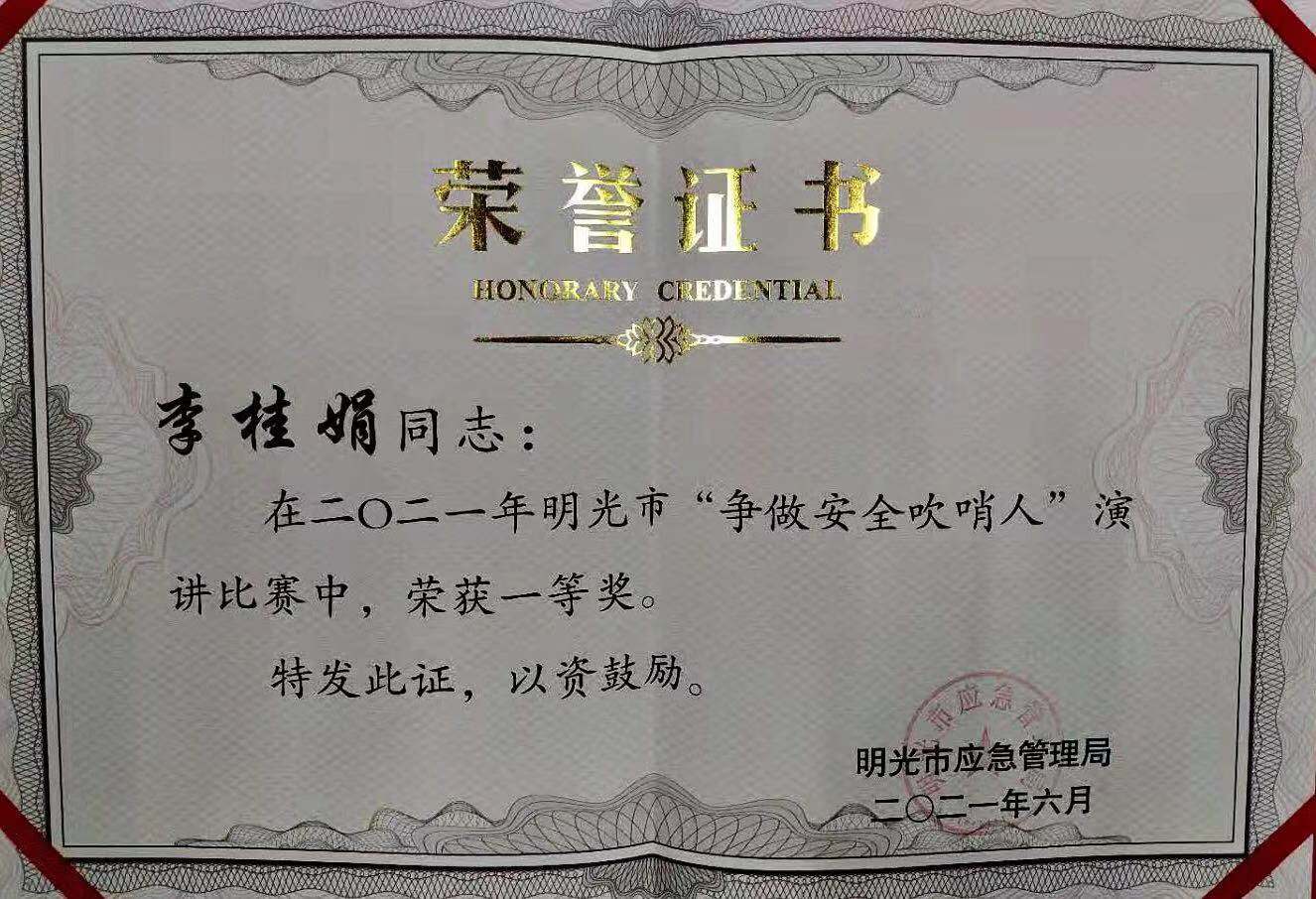 此次參加演講,公司高度重視,精心組織,行政、銷售、紀委、黨辦、工會、生產及安全等各部門大力支持,悉心指導。李桂娟同志演講內容緊扣主題,案例真實生動,語言清晰流暢,表達聲情并茂,最終在全市脫穎而出,受到現場評委和明光市應急管理局領導的高度贊揚。