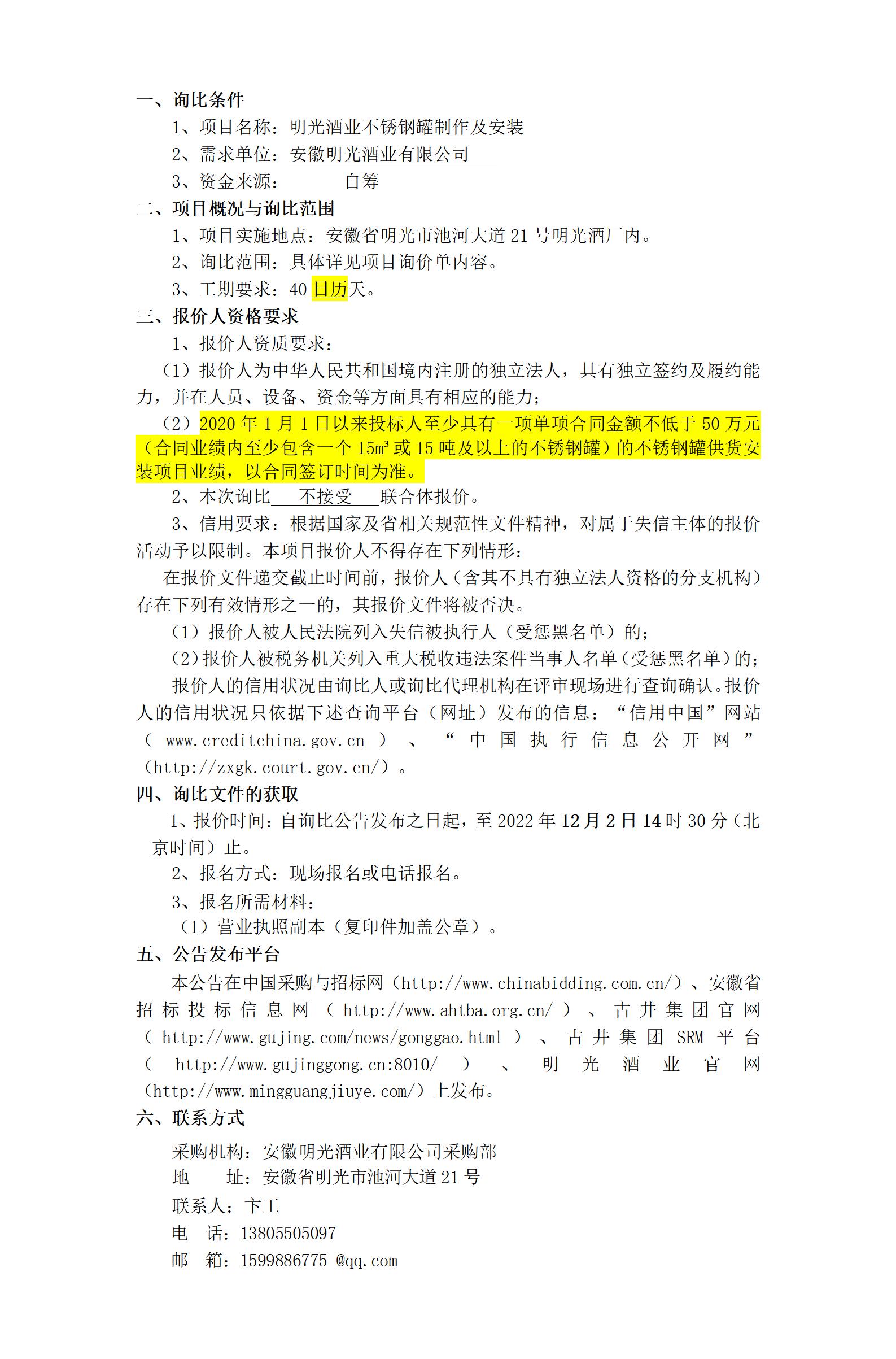 明光酒業不銹鋼罐制作及安裝項目詢比公告