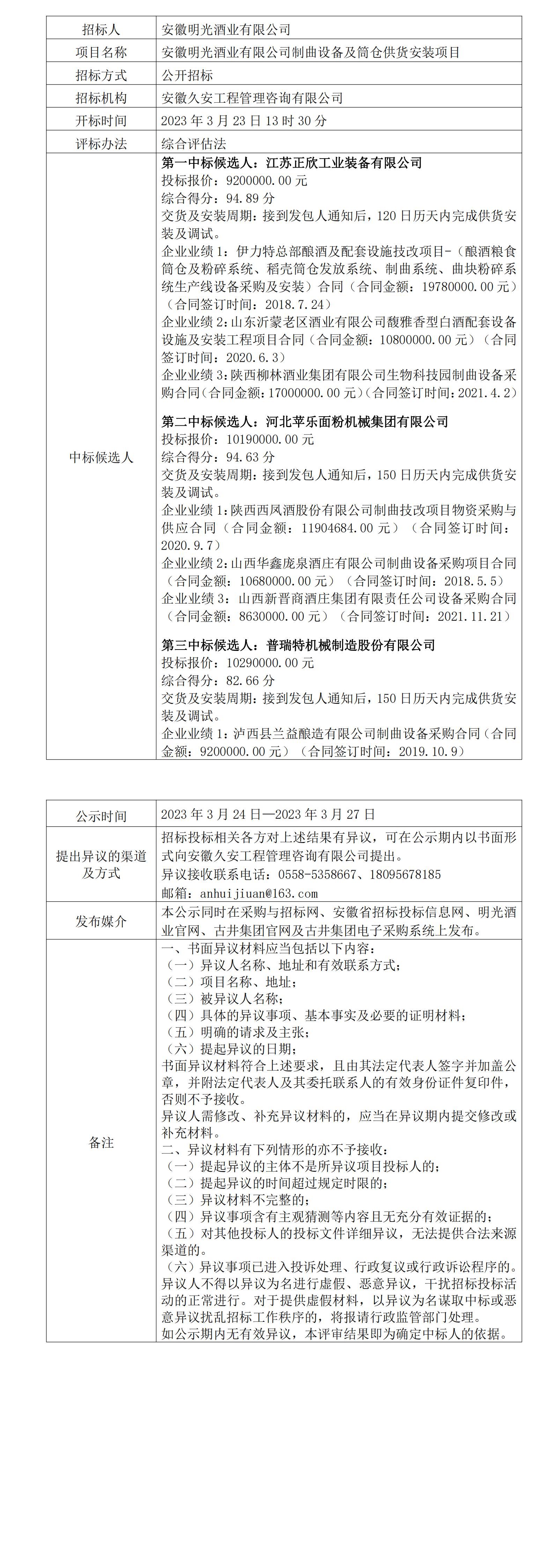 安徽明光酒業有限公司制曲設備及筒倉供貨安裝項目中標候選人公示