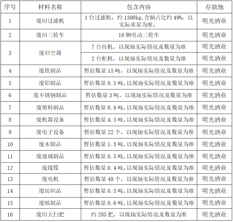 現(xiàn)對安徽明光酒業(yè)有限公司一批廢舊物資公開出售,具體出售事宜如下: