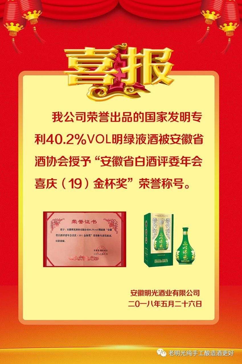 喜報:我公司榮譽出品的國家發(fā)明專利40.2%vol明綠液酒被安徽省酒協(xié)會授予“安徽省白酒評委年會喜慶(19)金杯獎”榮譽稱號。