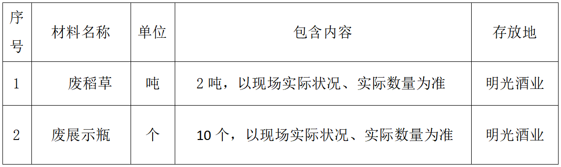 現(xiàn)對(duì)安徽明光酒業(yè)有限公司一批廢舊物資公開出售,具體出售事宜如下: