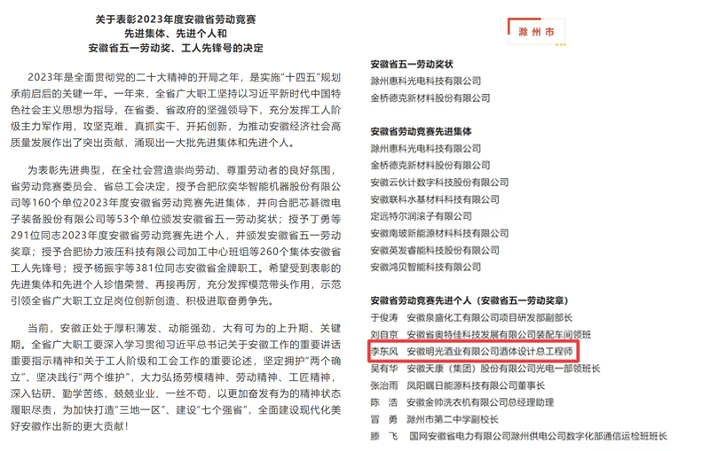 近日,安徽省勞動競賽委員會、安徽省總工會聯合印發《關于表彰2023年度安徽省勞動競賽先進集體、先進個人和安徽省五一勞動獎、工人先鋒號的決定》,我司酒體設計總工程師李東風榮獲“安徽省勞動競賽先進個人”,并被授予“安徽省五一勞動獎章”,充分展現了明光酒業職工扎實過硬的專業能力和奮發進取的精神風貌。