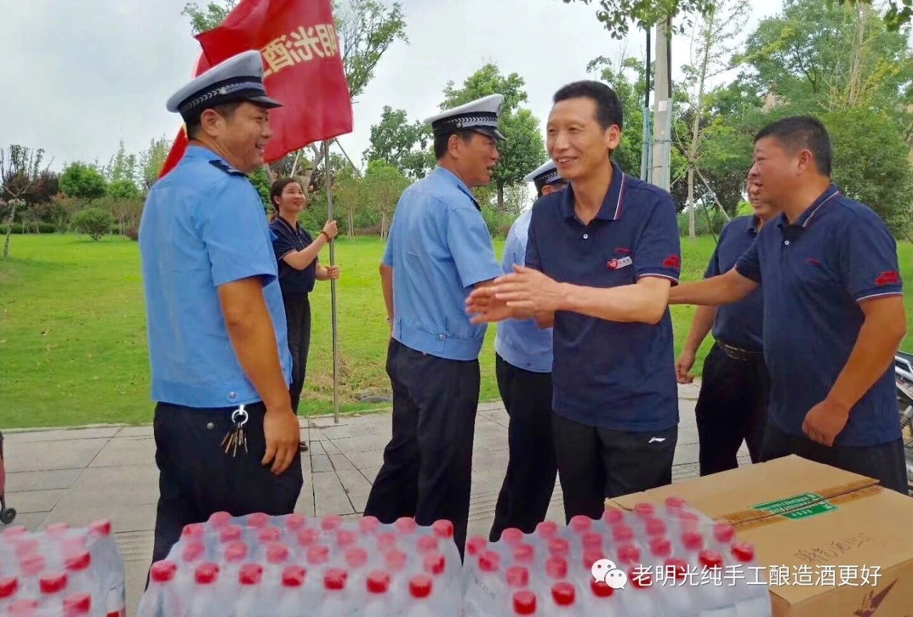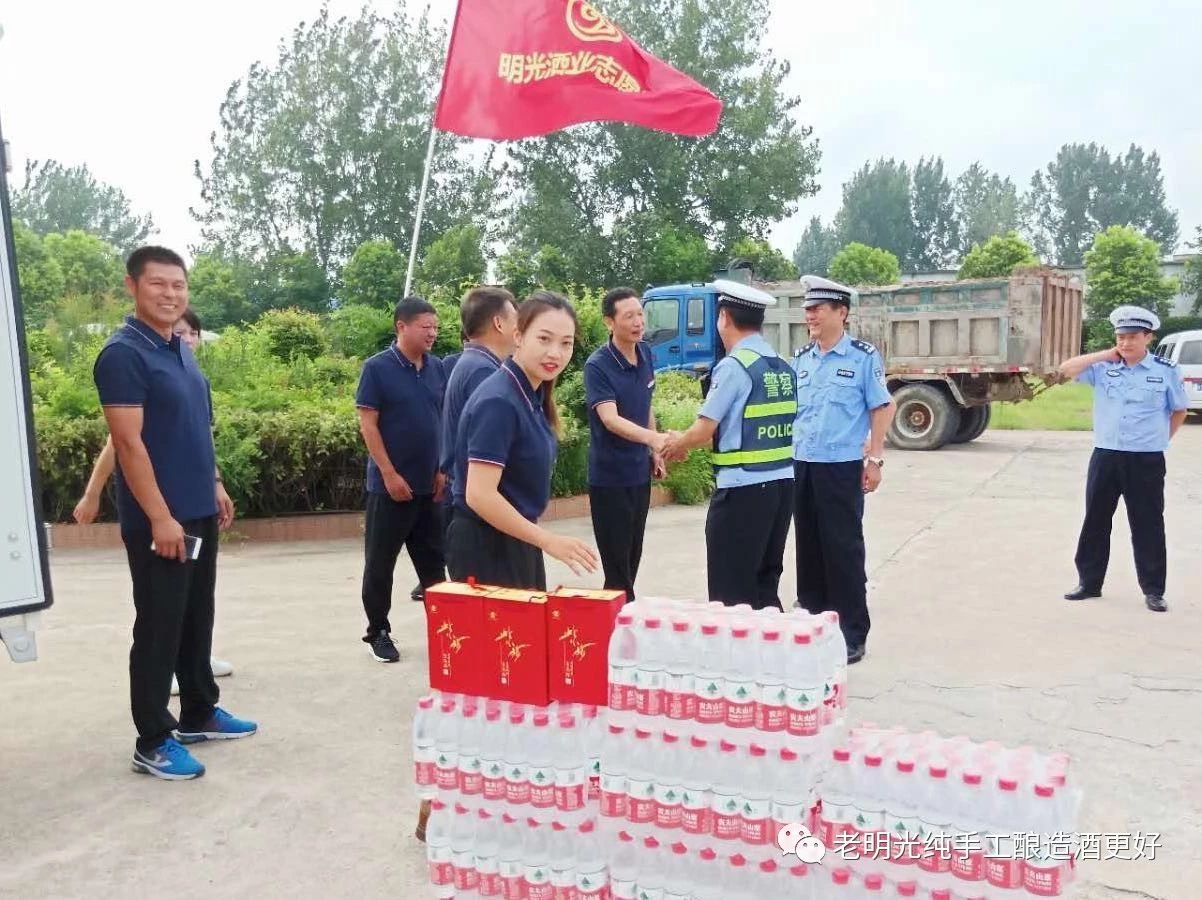 2018年8月3日,安徽明光酒業有限公司工會主席趙玉龍,銷售公司總經理助理劉楚攜明光區域經銷商代表一行,在明光市交警大隊王大隊長、許副大隊長引領下,驅車前往張八嶺、橋頭、澗溪等中隊,慰問烈日下的交通警察。