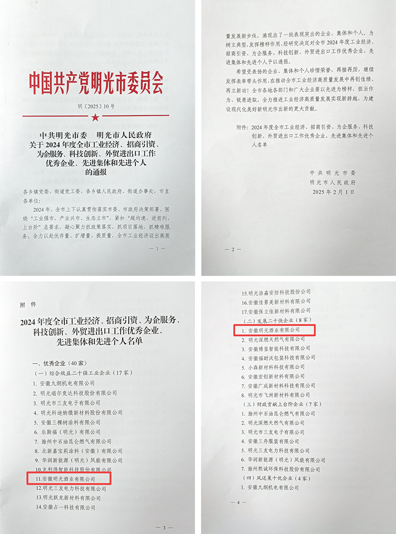 明光酒業獲明光市2024年度 綜合效益二十強工業企業等榮譽