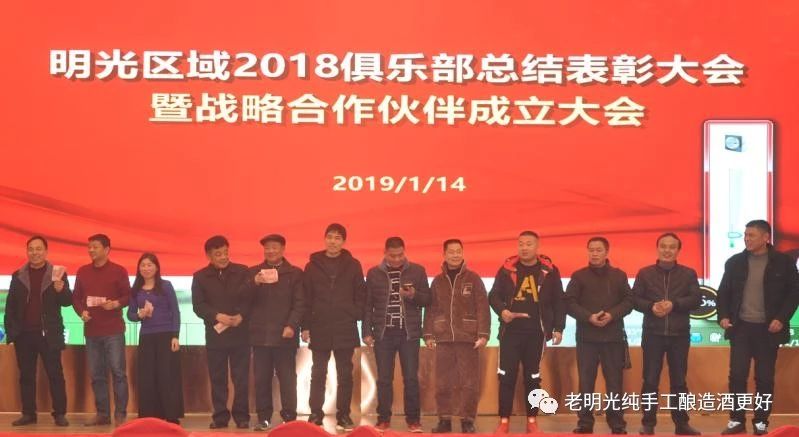 2018年元月14日17時,明光酒業明光辦事處在御明樓大酒店隆重召開“俱樂部總結表彰暨戰略合作伙伴聯盟成立大會”,明光酒業行政經理龐宗生、紀委書記閆興淮、銷售公司副總經理劉楚、監察部部長李茂武、黨群部部長錢軍及明光地區總經銷和俱樂部會員200余人參加了會議。